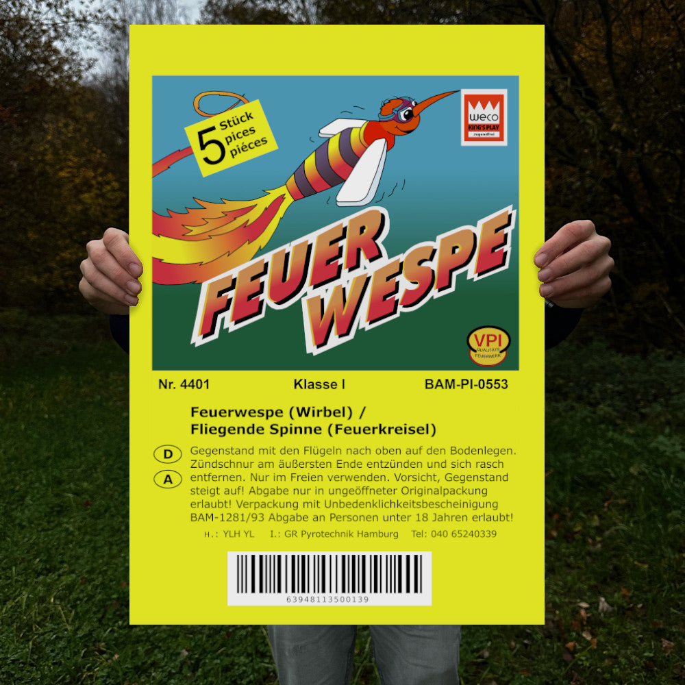 Dieses Poster präsentiert die originalgetreue, restaurierte Verpackung der legendären Weco Feuer Wespen – ein absolutes Highlight aus den frühen 90er-Jahren. Mit ihrem unverwechselbaren Design, das den feurigen Charakter dieser ikonischen Feuerwerksartikel perfekt einfängt, ist diese Verpackung ein Muss für jeden Sammler und Pyro-Fan. Die Feuer Wespen waren für ihre beeindruckenden Spiraleffekte und die typische Weco-Qualität bekannt und bleiben ein unvergesslicher Klassiker für alle Feuerwerksbegeisterten. Perfekt als nostalgische Wanddekoration oder als besonderes Sammlerstück – diese Neuauflage der Feuer Wespen-Verpackung weckt Kindheitserinnerungen und bringt den Charme klassischer Feuerwerke in dein Zuhause. !